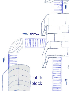The paradigm of the train tracks is another way to visualize flow diagrams which tries to incorporate a more dynamic view of the process of execution of code as the CPU (the locomotive) passes through the diagram. The houses are meant to illustrate the view that software is constructed at different levels of complexity, some parts might be simple, while other extremely complex, and each is a piece of work that requires design and effort.