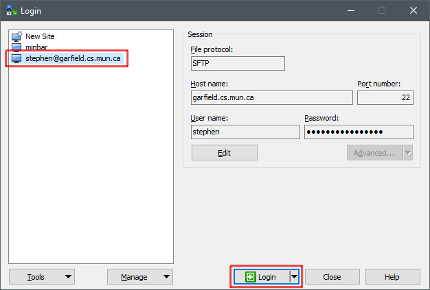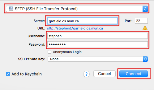 Make sure to enter the information as shown above. In particular, you must select "SFTP (SSH File Transfer Protocol)", otherwise a connection cannot be made. Enter the following information: Server => garfield.cs.mun.ca, Username/Password => your D2L username/password.
