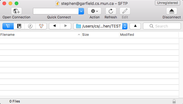 This window shows the remote filesystem (garfield.cs.mun.ca). You can then open a Finder window (which will be your local filesystem), and simply 'drag and drop' files to copy between the two systems.