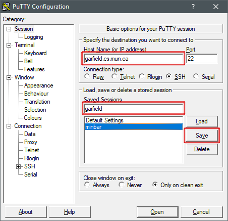 ssh USERNAME@garfield.cs.mun.ca