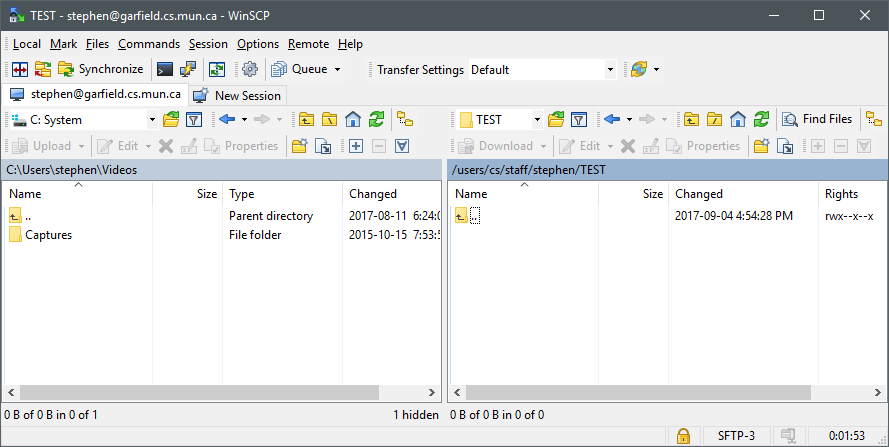 This window shows your local system to the left, and the remote system (garfield.cs.mun.ca) to the right. At this point, you change to the appropriate directories on both the local and remote sides, and simply 'drag and drop' files to copy between the two systems.