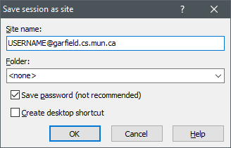 Enter the following information: Hostname => garfield.cs.mun.ca, Username/Password => the same as when you log in to one of our systems in the lab. Do not change any other setting.