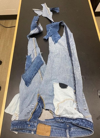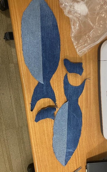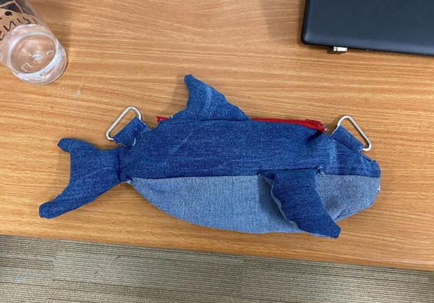 A crossbody bag that looks like a shark made out of old jeans that I upcycled! The interior is canvas from an old tote bag, and the exterior is an old pair of jeans that didn't fit anymore! The buckle to adjust the strap length is 3D printed.